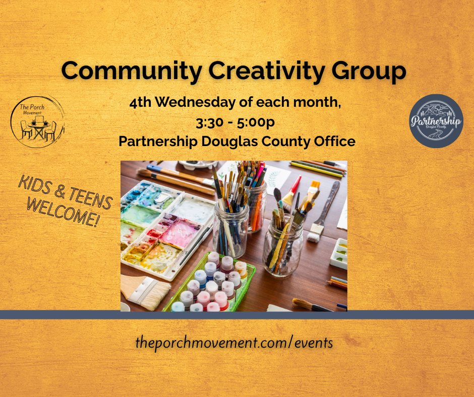 A fun way to meet others or enjoy some creative time with family, friends, or neighbors. Supplies & Snacks provided! We are grateful to Partnership Douglas County for providing a creative space for us!